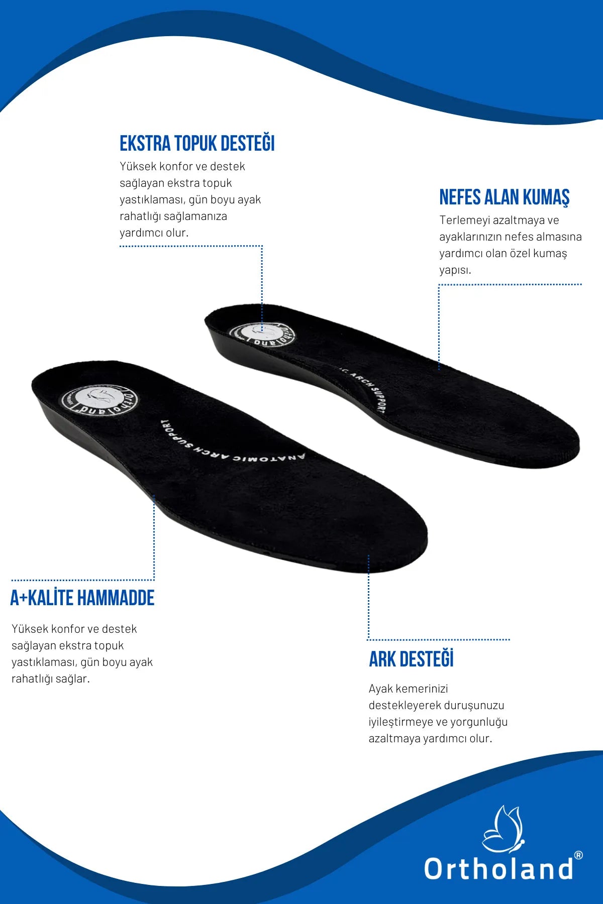 Manufactured with superior production technology, the insoles take the shape of the user's feet with their increased sole support feature and lightweight design, providing convenience and comfort with every step throughout the day.