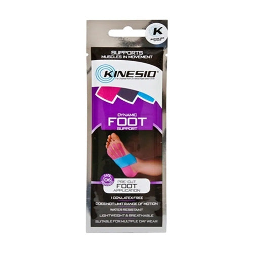 - Kinesio Pre-cut Foot Application The Kinesio Pre-Cut Foot Support is designed to treat plantar fasciitis to provide support to the arch of the foot and relieve associated discomfort. Each package includes a single-use, customizable strip set and instructions. Each Foot Support application comes with one blue I-strip cut from the original Kinesio Tex Tape Classic and two pink fan strips. Plantar fasciitis is a very common source of foot and heel pain. The condition occurs when tears occur in the long fibrous plantar fascia ligament on the bottom of the foot, causing pain and inflammation. The most common symptom is a burning, stabbing, or aching pain in the heel of the foot. The pain may be especially acute when getting out of bed in the morning and applying pressure to the ligament. The pain usually subsides as the tissue warms, but it can easily reoccur when getting up from prolonged standing or weight-bearing, physical activity, or prolonged inactivity or sitting. Foot discomfort can greatly reduce your ability to perform activities such as strenuous exercise, playground tasks, or simply standing and waiting. Rely on Kinesio Dynamic Foot Support to keep up with your busy schedule.